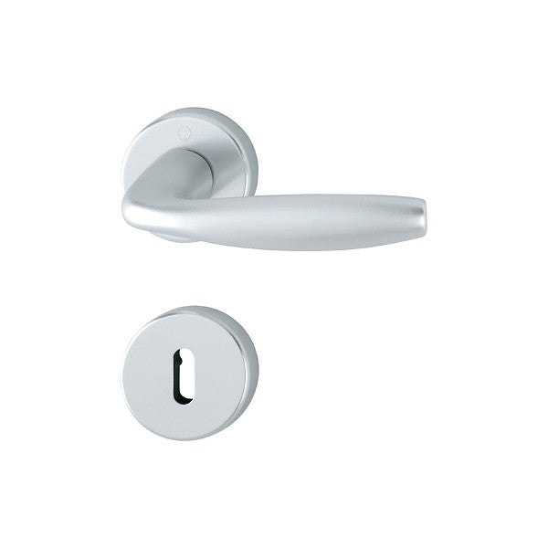 Maniglia Hoppe per porte interne, serie New York in alluminio su rosetta e bocchetta tonda.